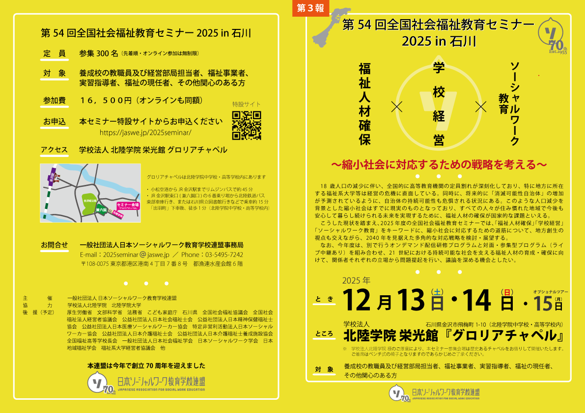こうした現状を踏まえ、2025年度の全国社会福祉教育セミナーでは、「福祉人材確保」「学校経営」「ソーシャルワーク教育」をキーワードに、縮小社会に対応するための道筋について、地方創生の視点も交えながら、2040年を見据えた多角的な対応戦略を検討・展望する。